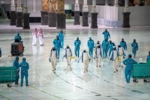 من جهتها، جندت الرئاسة العامة لشؤون المسجد الحرام والمسجد النبوي إمكاناتها لعمليات التطهير والتعقيم بالمسجد الحرام من خلال قرابة ( ٤٠٠٠ )عامل وعاملة، مجهزين بأكثر من (٤٧٠) آلة لتنظيف وتطهير المسجد الحرام، والإشراف والمتابعة لخطة مشروع خدمات ونظافة المسجد الحرام، المتضمنة تكثيف عمليات غسل جميع المواقع بالمسجد الحرام وساحاته, والتطهير المستمر للمداخل الرئيسة والمشايات والممرات والمصليات داخل المسجد الحرام وساحاته ورش المطهرات على مناهل التصريف والمجمعات .