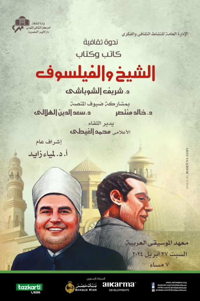 القاهرة _ محمد قنديل ضمن الفعاليات التنويرية للثقافة المصرية تنظم دار الأوبرا برئاسة الدكتورة لمياء زايد ندوة تاتى فى اطار نشاطها الثقافى والفكرى لمناقشة كتاب “الشيخ والفيلسوف” للدكتور شريف الشوباشى بحضوره مع الاعلامى الدكتور خالد منتصر ، الدكتور سعد الدين…