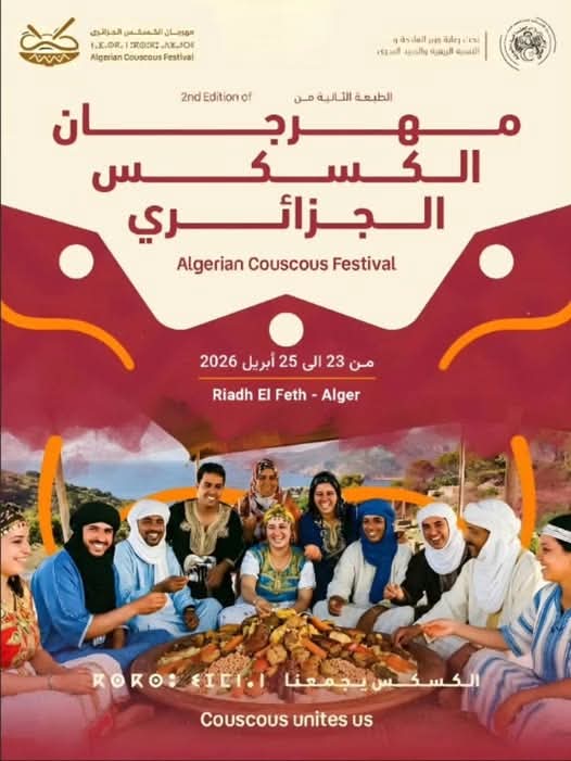 الطبعة الثانية لمهرجان الكسكس الجزائريمن 23 إلى 25 أفريل 2026 رياض الفتح الجزائر