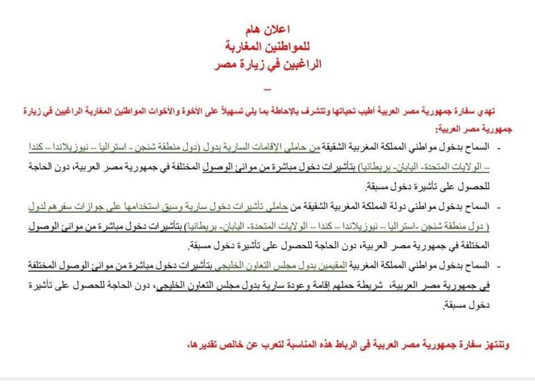 كما يشمل القرار، وفق السفارة، المواطنين المغاربة المقيمين بدول مجلس التعاون الخليجي، شريطة أن تكون لديهم إقامة وعودة ساريتان، مع السماح لهم بدخول مصر مباشرة من نقاط الوصول بدون تأشيرة مسبقة