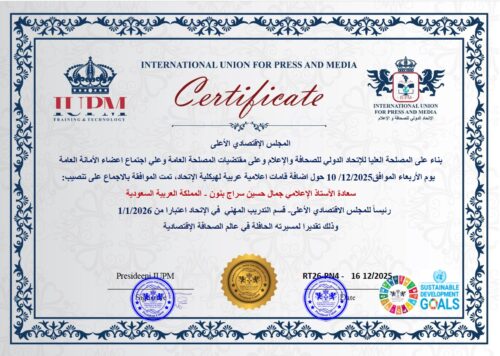 أقرت الأمانة العامة للاتحاد الدولي للصحافة والإعلام تنصيب الإعلامي والكاتب الاقتصادي السعودي جمال بنون رئيساً للمجلس الاقتصادي الأعلى بقسم التدريب المهني في الاتحاد، وذلك اعتباراً من الأول من يناير 2026.