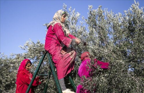 تهيّء الأخريات الصناديق البلاستيكية المعدّة لتجميع الحبّات.