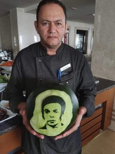 واوضح انه اعتاد على صنع البيتزا التي تحمل وجه المشاهير والنجوم وعن مكونات البيتزا، بالإضافة إلى نحت صورهم على البطيخ، لافتا إلى انه قام برسم العديد من البوتوريهات لشماهير مصريين وغيرهم من نجوم الفن والسياسة والرياضة.
