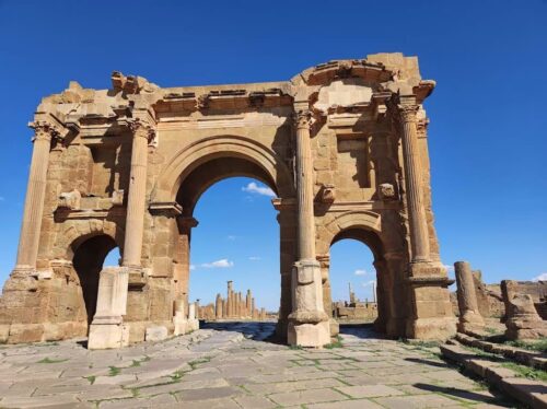تعد مدينة تيمقاد الأثرية في ولاية باتنة بالجزائر إحدى أروع الشواهد على الحضارة الرومانية في شمال إفريقيا. أسسها الإمبراطور الروماني تراجان عام 100 ميلادية كمستعمرة عسكرية وسكنية، وكانت تُعرف قديمًا باسم “ثاموقادي” Tamugadi، والتي اشتُق منها الاسم الحالي “تيمقاد”.