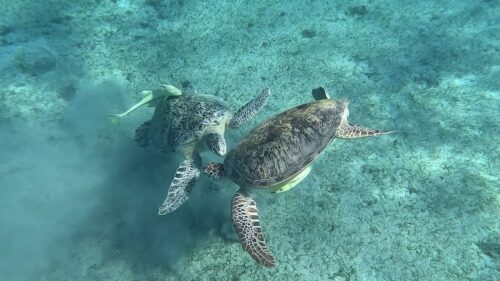 السلاحف البحرية الخضراء: من الأنواع المهددة بالانقراض والتي تتغذى على الأعشاب البحرية المنتشرة في الخليج.