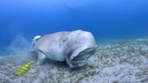 الدوجونج “عروس البحر”: حيوان بحري نادر من فصيلة الثدييات، يتغذى على الحشائش البحرية ويصعد إلى سطح الماء كل 3 إلى 5 دقائق للتنفس.