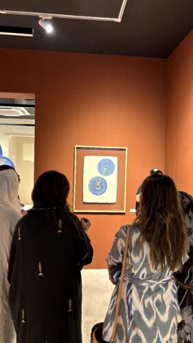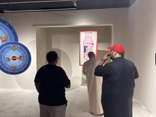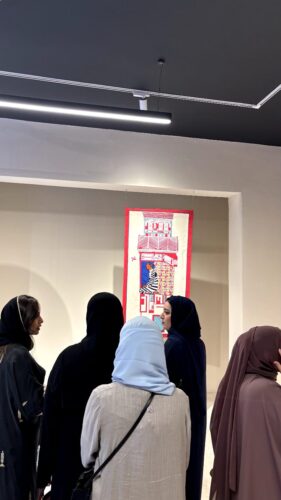 The exhibition brings together gouache and charcoal works, hand-printing techniques, and textile-based compositions, expanded through two significant collaborations. The first, with Tabaa’, a label founded by the artist, is embodied in Grantors of Permission, where flowing silk threads articulate two Hijazi female figures within a composition inspired by the roshan (mashrabiya) architectural form. The second, coordinated by Dr. Saif Al-Rashidi, engages master artisans from Cairo specializing in khayamiya, one of the oldest textile traditions in the Islamic world. These collaborations extend the exhibition’s inquiry into temporality, craftsmanship, and the transmission of knowledge across generations.