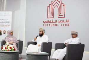 بعدها بدأت الجلسة الحوارية بمشاركة الدكتور حميد الحجري من جامعة الشرقية والاستاذ سالم المنظري من شركة إبانة والأستاذة روان ناصر المعثم من مجمع الملك سلمان العالمي للغة العربية وأدارتها الإعلامية شيخة المحروقية .