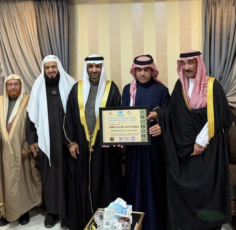 تمّ تتويج سمو الشيخ الدكتور عبدالعزيز بن علي النعيمي ( المستشار البيئي لحكومة عجمان أحد أفراد الأسرة الحاكمة بعجمان والملقب بالشيخ الأخضر) بجائزة القائد المؤثر في البيئة الخضراء من منظمة الأمم المتحدة للتدريب والإعلام un mtc والتي مقرها لندن وتم كذلك منح سموه عضوية المنظمة نظير جهوده العالمية والدولية في خدمة البيئة