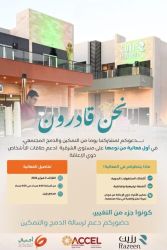 وتُقام المبادرة بتنظيم مشترك بين مركز أكسل أجيال العالمي، وشركة رزين العقارية، وجمعية أجيال الترفيهية، في إطار شراكة مجتمعية تهدف إلى تقديم نموذج عملي للدمج المجتمعي والمهني للأفراد ذوي الإعاقة.