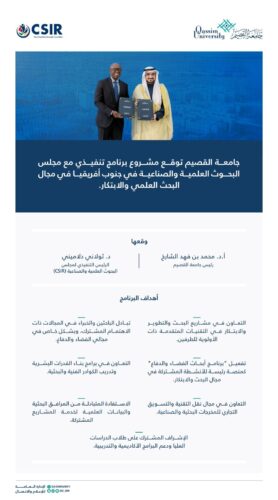 وقع سعادة رئيس جامعة القصيم الأستاذ الدكتور محمد بن فهد الشارخ، والرئيس التنفيذي لمجلس البحوث العلمية والصناعية بجنوب أفريقيا (CSIR) الدكتور ثولاني دلاميني مشروع برنامج تنفيذي بين الجامعة والمجلس، في مجال البحث العلمي والابتكار، بحضور وكلاء الجامعة بالمدينة الجامعية.