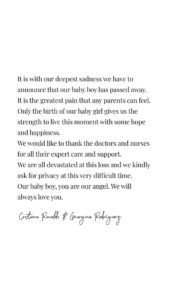 وأتم: «لقد دُمرنا ونطالب بالخصوصية في هذا الوقت الصعب للغاية، ولدنا أنت ملاكنا، سنحبك للأبد»