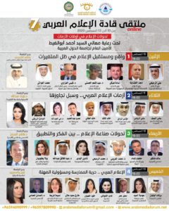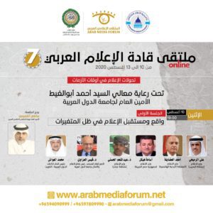 أعلنت هيئة الملتقى الإعلامي العربي في بيان صادر صباح اليوم عن إقامة النسخة السابعة من “ملتقى قادة الإعلام العربي” تحت شعار تحولات الإعلام في أوقات الأزمات، برعاية معالي السيد أحمد أبوالغيط الأمين العام لجامعة الدول العربية، وذلك خلال الفترة من 10 إلى 13 أغسطس 2020، عن طريق الأون لاين بخاصية الفيديو كول، وبمشاركة أصحاب المعالي وزراء الإعلام العرب، على الرميحي وزير الإعلام البحريني، أمجد العضايلة وزير الإعلام الأردني، أسامة هيكل وزير الإعلام المصري، د.عبدالمنعم الحسني وزير الإعلام العماني، د.قيس العزاوي الأمين العام المساعد رئيس قطاع الإعلام والاتصال بجامعة الدول العربية، ومحمد العواش رئيس اتحاد إذاعات الدول العربية، بالإضافة إلى عدد من الإعلاميين والاكاديميين وملاك الوسائل الإعلامية.
