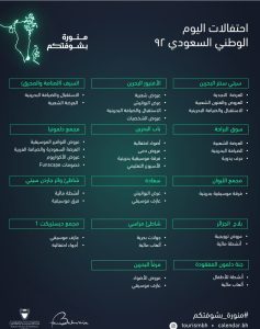هذا وستنشر الهيئة على حسابها على انستغرام عددا من الفعاليات التي ستقيمها الكثير من منشآت القطاع السياحي خصيصا بمناسبة اليوم الوطني السعودي، ويكتسي باب البحرين بشكل خاص بأضواء احتفالية من وحي المناسبة، إضافة إلى عروض دمى، وغيرها، كذلك يحتفي مشروع “سعادة” بهذه المناسبة من خلال العديد من الفعاليات، وينظم مجمع الليوان بالهملة فعاليات مشابهة.