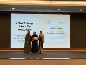 شهدت كلية ادارة الاعمال احتفال مميز لقسم التسويق برئاسة الدكتورة/شريفة احمد لتكريم اعضاء هيئة التدريس والاداريين من داخل وخارج القسم والطلبة المتميزين من مرحلتي البكالوريوس والماجستير والطلبة الفائزين بمسابقة كارتيه العالمية وطلبة جاهزية وطلبة العمل التطوعي واعضاء اللجنة الاستشارية بما يقارب من ٣٠٠ تكريم احتفاء بجميع من شارك في فعاليات القسم وساهم في رفعة شأنه خلال العام الأكاديمي الحالي.