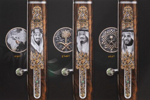 وأوضح أولف أولسون من شركة “فيغو” السويدية المتخصصة في النقش اليدوي على الأسلحة والسكاكين والسقف الخارجي للسيارات الفاخرة، أن المجموعة صُممت استلهامًا من الهوية السعودية وما تمثله من عراقة وتميّز، وذلك ضمن سلسلة محدودة تجمع بين النقش اليدوي والفخامة العصرية، مشيرًا إلى أنها تتكون من ثلاث حزم فقط تشمل بندقية وسكينًا وسيارة «G63» تحمل جميعها اللونين الأخضر والأبيض وتطعيمات من الذهب عيار 24 وأحجار كريمة خضراء مستوحاة من ألوان العلم السعودي.