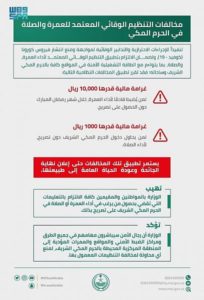 صرَّح مصدر مسؤول بوزارة الداخلية، بأنه تنفيذاً للإجراءات الاحترازية والتدابير الوقائية لمواجهة ومنع انتشار فيروس كورونا (كوفيد – 19)، ولضمان الالتزام بتطبيق التنظيم الوقائي المعتمد لأداء العمرة والصلاة، بما يتواءم مع الطاقة التشغيلية الآمنة في المواقع كافة بالحرم المكي الشريف وساحاته، فقد تقرر تطبيق المخالفة النظامية بحق من يُضبط قادماً لأداء العمرة، خلال شهر رمضان المبارك، دون الحصول على تصريح، بغرامة مالية قدرها (10,000) ريال، كما تقرر مخالفة من يحاول دخول الحرم المكي الشريف دون تصريح، لأداء الصلاة، بغرامة مالية قدرها (1000) ريال، وذلك حتى إعلان نهاية الجائحة وعودة الحياة العامة إلى طبيعتها.