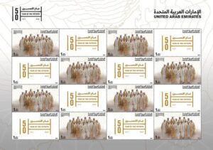 احتفالاً باليوم الوطني الخمسين لدولة الإمارات العربية المتحدة وتخليداً لإنجازاتها غير المسبوقة على مدى العقود الخمسة الماضية، أصدرت مجموعة بريد الإمارات طوابع وبطاقات تذكارية تتضمن 9 إصدارات مختلفة، تشمل 7 بطاقات تذكارية تضم صور حكام الإمارات السبعة، وبطاقة تذكارية تجمع حكام الإمارات وأولياء عهودهم، إضافة إلى طوابع تحمل شعار عام الخمسين، وحكام دولة الإمارات وأولياء عهودهم.
